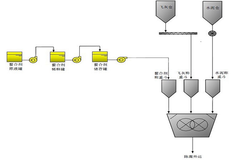 垃圾焚燒煙氣中收集的飛灰含有重金屬、二噁英等有害物質,按一定比例加入水、螯合劑、水泥將其固化后填埋。