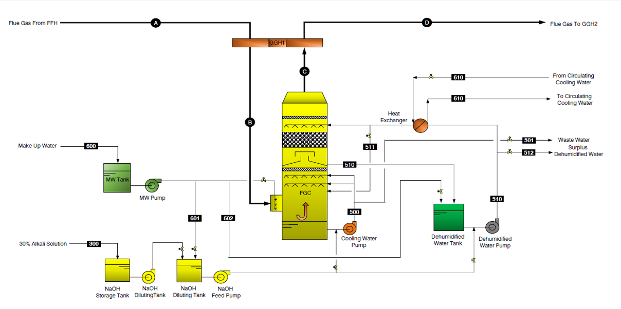 采用單塔雙循環一體塔技術,高溫煙氣由下部進入,經冷卻吸收部和減濕吸收部后排出。酸性污染物、超細粉塵、氣溶膠等被脫除,飽和煙氣中的氣態水被冷凝析出。