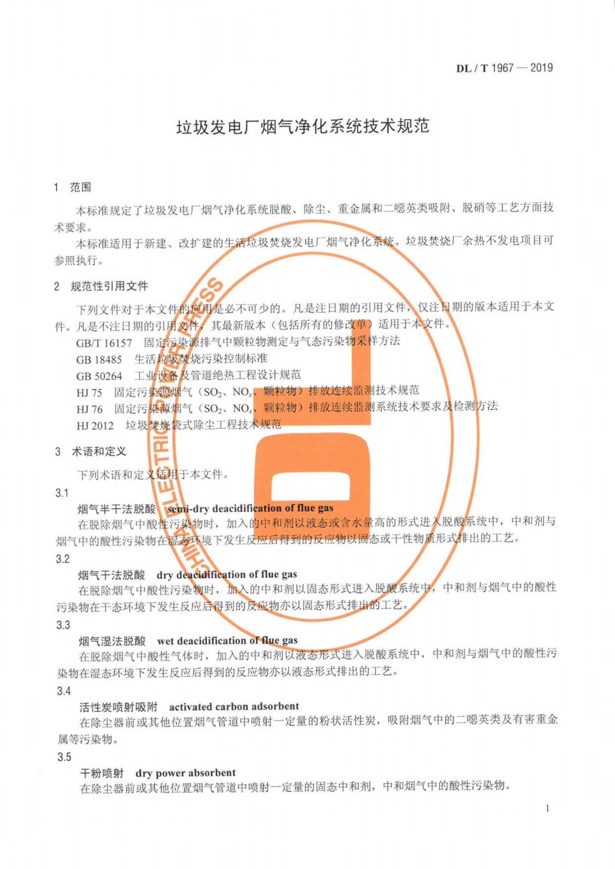 《垃圾發(fā)電廠煙氣凈化系統(tǒng)技術(shù)規(guī)范》