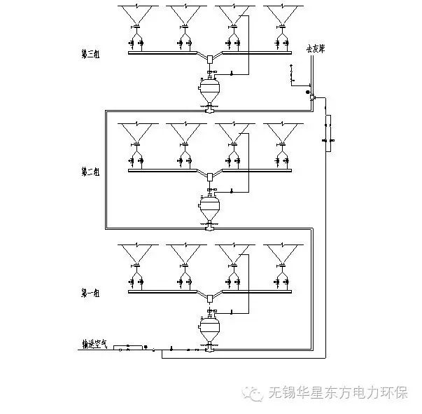 鍋爐尾部飛灰經布袋除塵器收集后均勻的分布在除塵器灰斗內,按其結構將其分為3組,每組4個灰斗,共12個灰斗,每組的4個灰斗通過空氣斜槽集中并配1臺2.5m3倉泵,共3臺倉泵,3臺倉泵通過1根管道串連輸送至遠方灰庫,其布置如圖一。