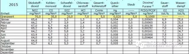 雖然歐洲2000的排放標準是我們國內(nèi)所熟知和引用了,但是歐洲各國或地區(qū)所采用的標準則會比歐盟2000更為嚴格,以下圖為例,是Arnoldstein焚燒廠的最新排放公布數(shù)據(jù),其中黃色行則是Arnoldstein當?shù)厮试S的排放標準,我引用在此供大家參考,這一現(xiàn)象與我國各地簽訂BOT項目需要高于國家標準的情況類似。