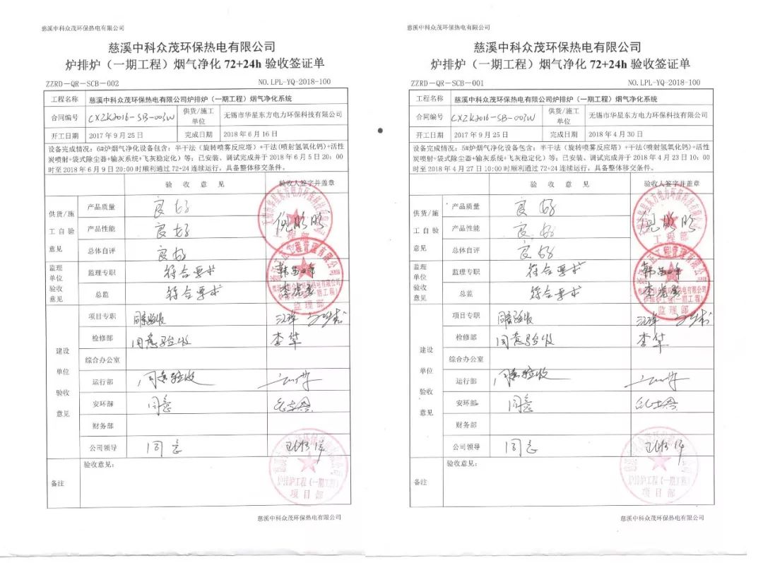 我司中標承建的浙江慈溪生活垃圾焚燒廠3x750t/d爐排爐煙氣凈化工程,一期工程2x750t/d于2018年6月遞交竣工申請,通過近半年的試運行,該工程于近日通過竣工驗收。