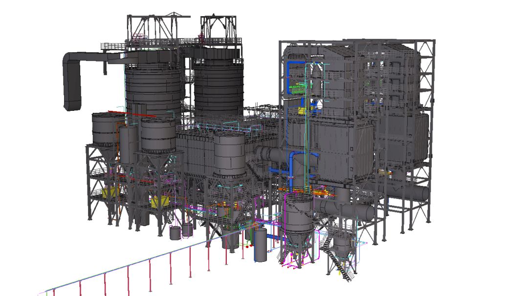 該項目采用了BIM模式執行,由蘇州工廠完成了公用系統及其鋼結構生產,泰州工廠完成了吸收塔及除塵器鋼結構和主體設備制造,無錫工廠完成了核心設備及電控設備的制造,工程部完成項目的現場設備栓接組裝和系統的建設安裝。