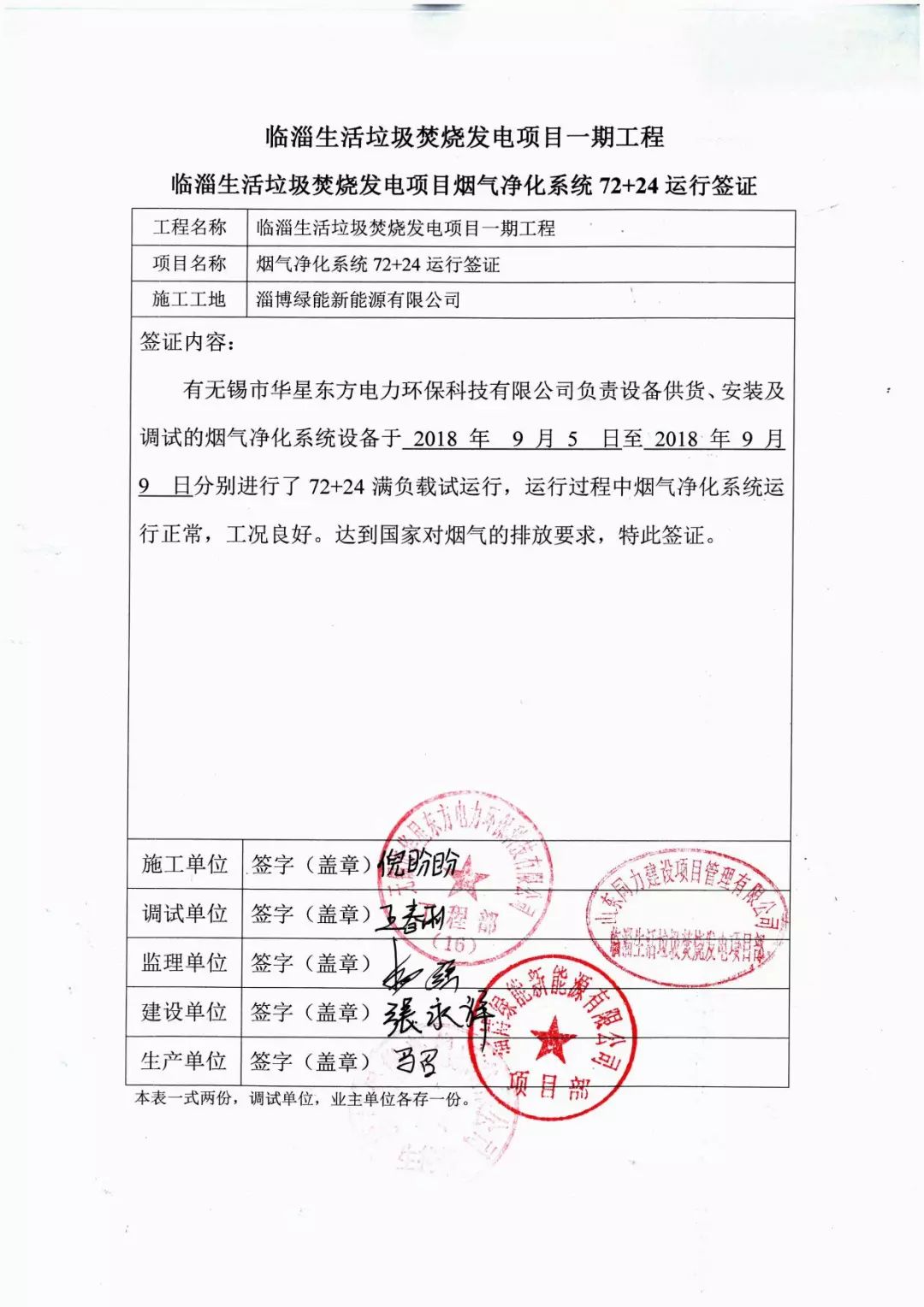 山東臨淄1x1000t/d生活垃圾焚燒發電煙氣凈化工程通過72+24小時驗收
