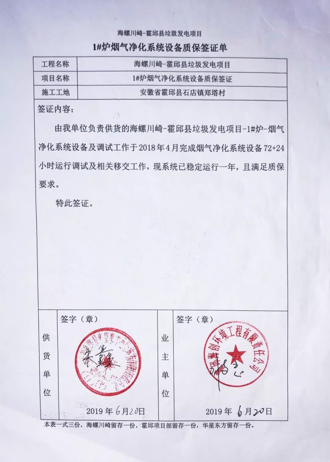我司承建的霍邱縣1x300t/d生活垃圾焚燒發電煙氣凈化工程于2019年6月20日通過質保驗收。