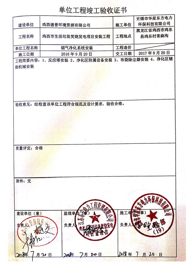 我公司承建的雞西市生活垃圾焚燒發電項目于2019年5月通過環保驗收,現該項目運行穩定,各項參數符合設計要求。