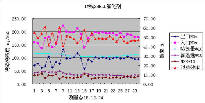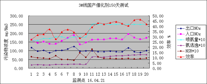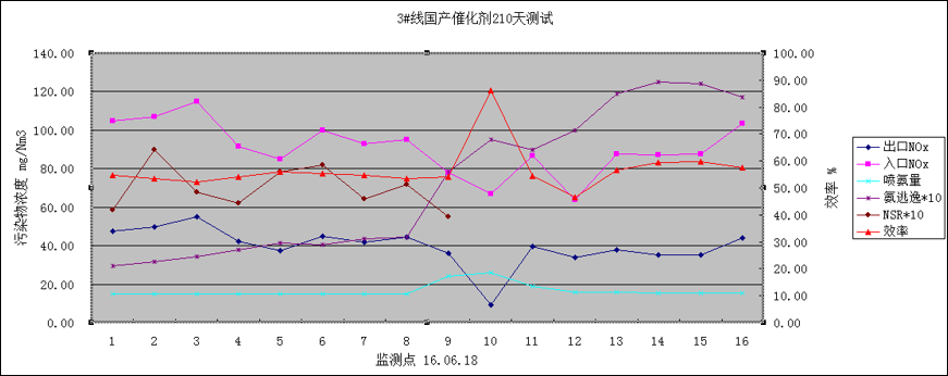 其次,對催化劑的效率進行了安裝初期(詳見圖14)、投運30天(詳見圖15)、150天(詳見圖16)、210天(詳見圖17)的4次取樣測試,以下為4次測試的相關數(shù)據(jù)(運行溫度170-175度)。