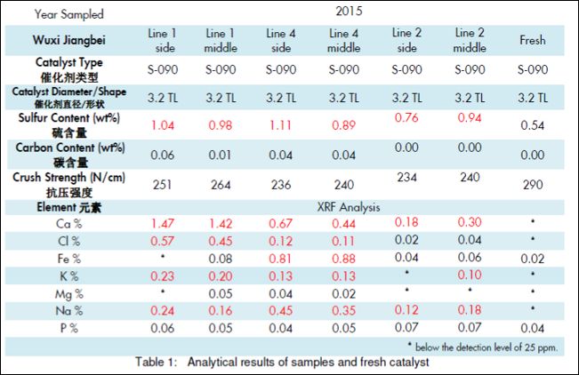 上述測定表明4條線催化劑均出現(xiàn)了K、Ca、Na、Mg等堿金屬中毒現(xiàn)象;3#線催化劑表面S未見明顯升高現(xiàn)象,其余幾條線S出現(xiàn)了升高現(xiàn)象;除2#線外,其余催化劑均有Cl含量升高現(xiàn)象;1#到4#線催化劑活性分別下降24%和31% 、4%和5%、27%和28%、25%和40%。與此同時,粒子狀催化劑在中國其他同類項目中的應用也遇到了類似問題。
