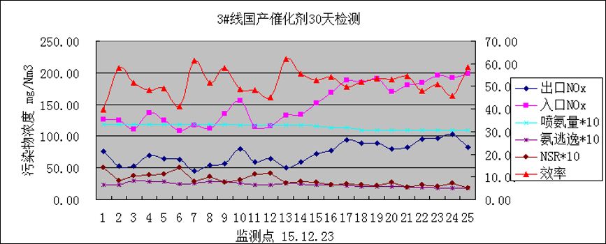 在進行上述檢測前,我們對2號線的催化劑性能分別于2015年9月18日/19日及10月15日/16日還進行了2次效率檢測,此時2號線的累計有效使用時間約為5個多月,在控制相同邊界條件如:噴氨量,氨逃逸量,鍋爐負荷,煙氣流量等數(shù)據(jù)的情況下,其2次檢測效率約在30-40%之間。