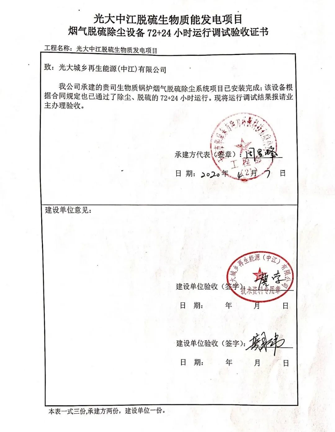 華星東方承建的光大中江生物質(zhì)發(fā)電項(xiàng)目煙氣凈化工程于2020年4月7日通過(guò)72+24小時(shí)驗(yàn)收。