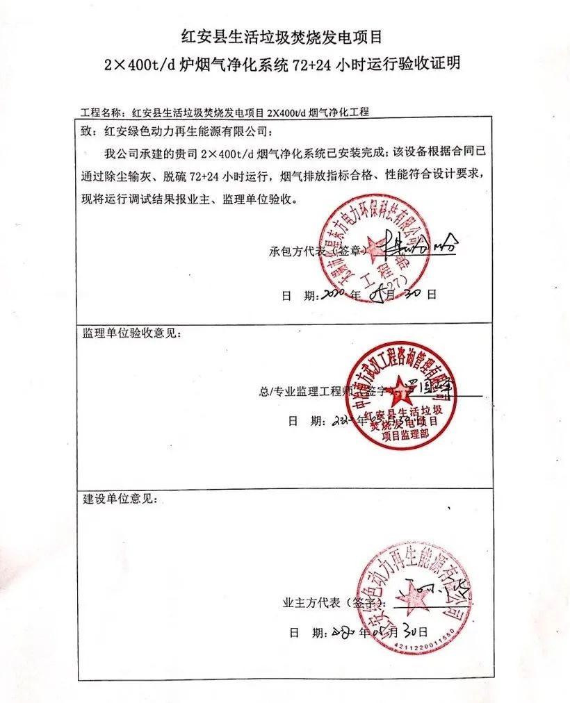我公司承建的湖北省黃岡市紅安縣生活垃圾焚燒發(fā)電項目煙氣凈化工程于2020年5月30日通過72+24小時試運行。