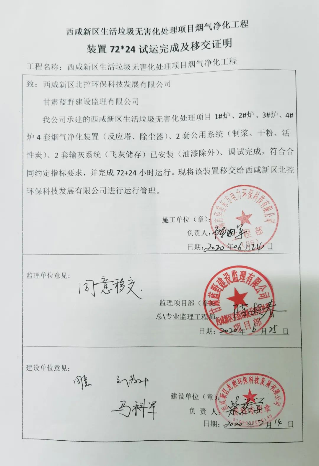 我公司承建的陜西省西咸新區生活垃圾無害化處理項目煙氣凈化工程于2020年7月14日通過72+24小時試運行。