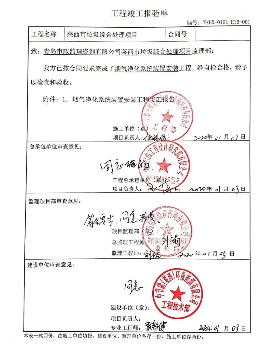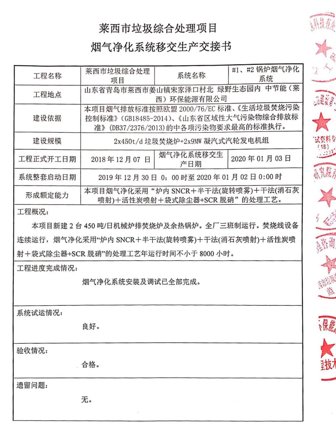 我公司承建的中節(jié)能(萊西)生活垃圾焚燒發(fā)電項目煙氣凈化工程于2020年1月3日通過竣工驗收。