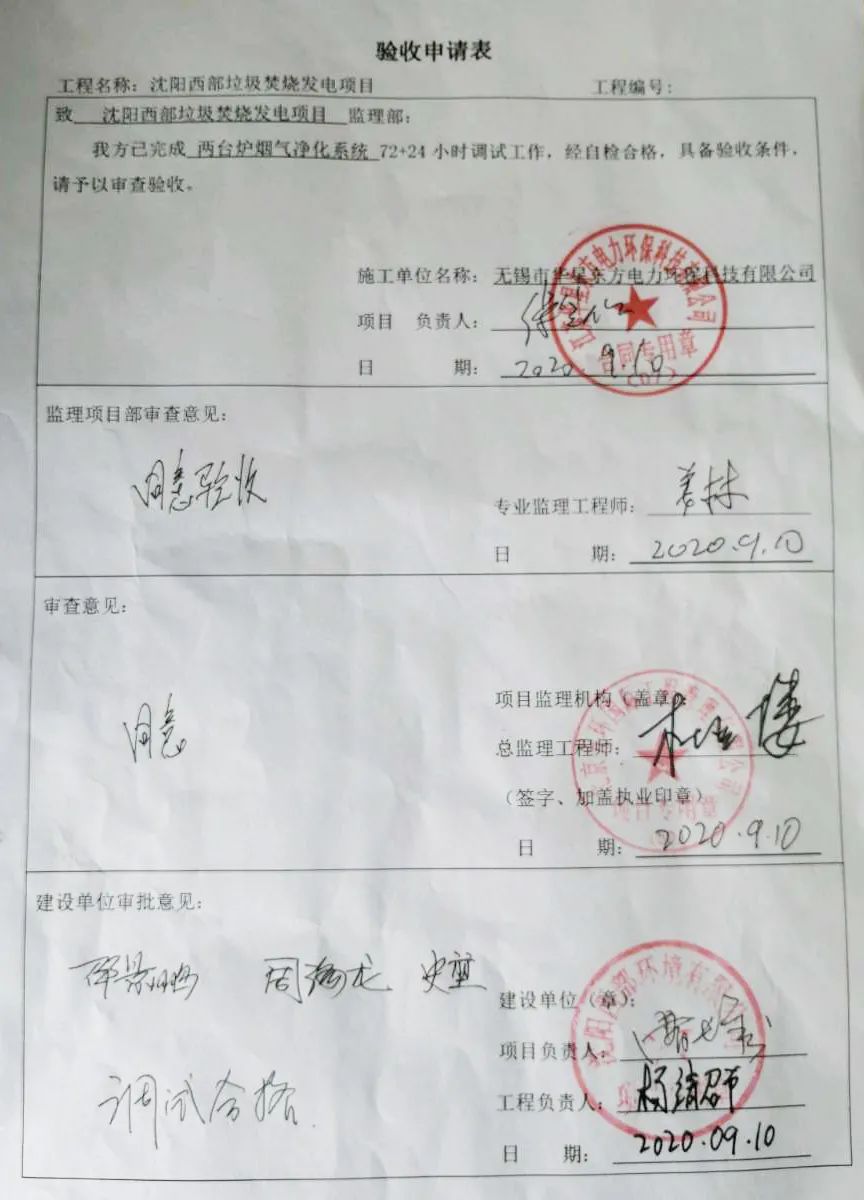 我公司承建的遼寧省沈陽西部垃圾焚燒發電項目煙氣凈化工程于2020年9月10日通過72+24小時試運行。