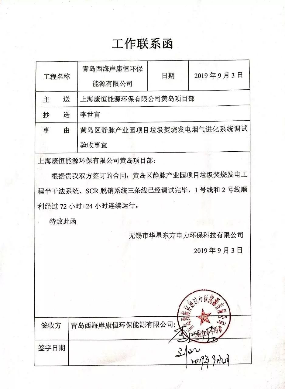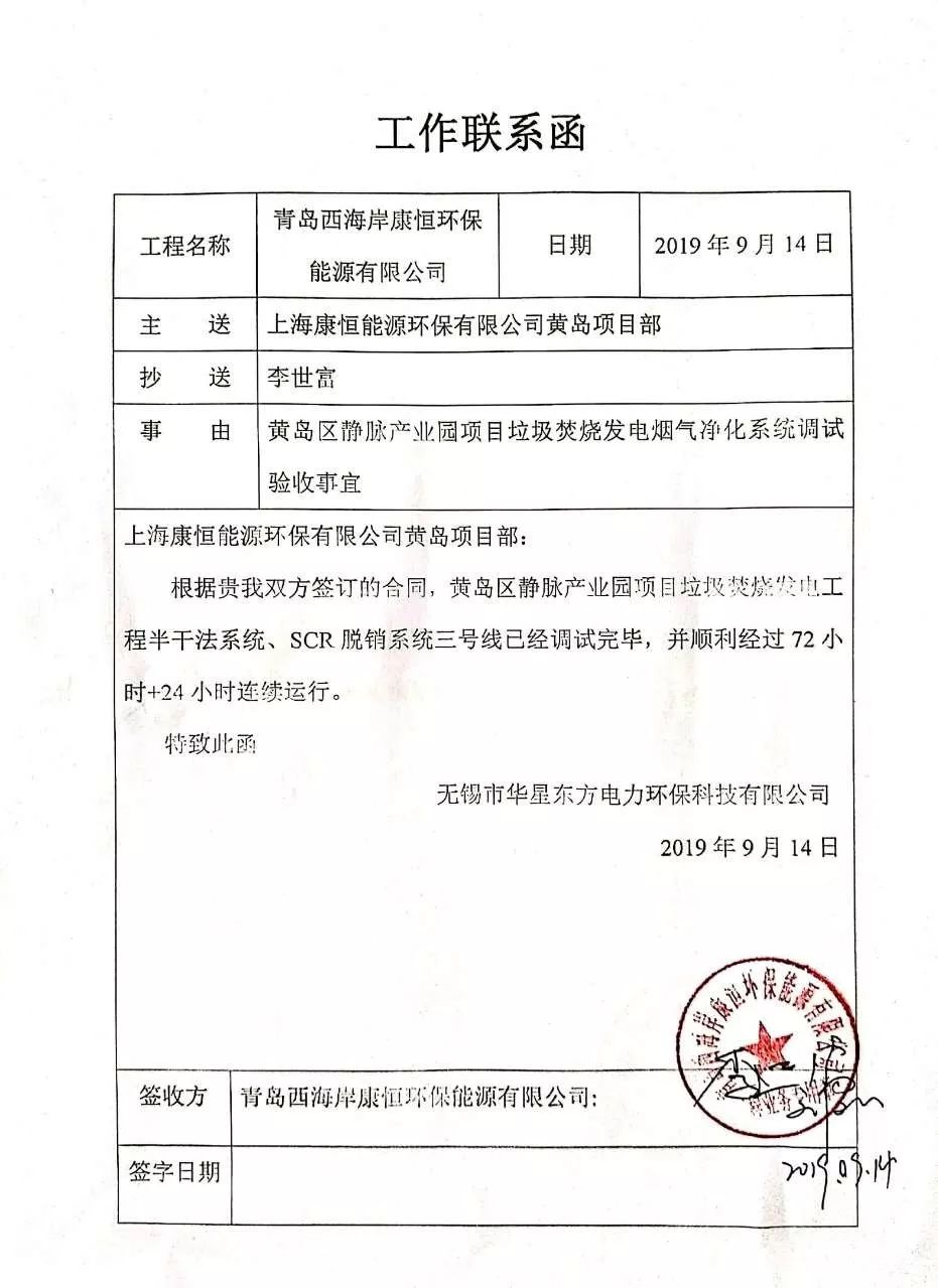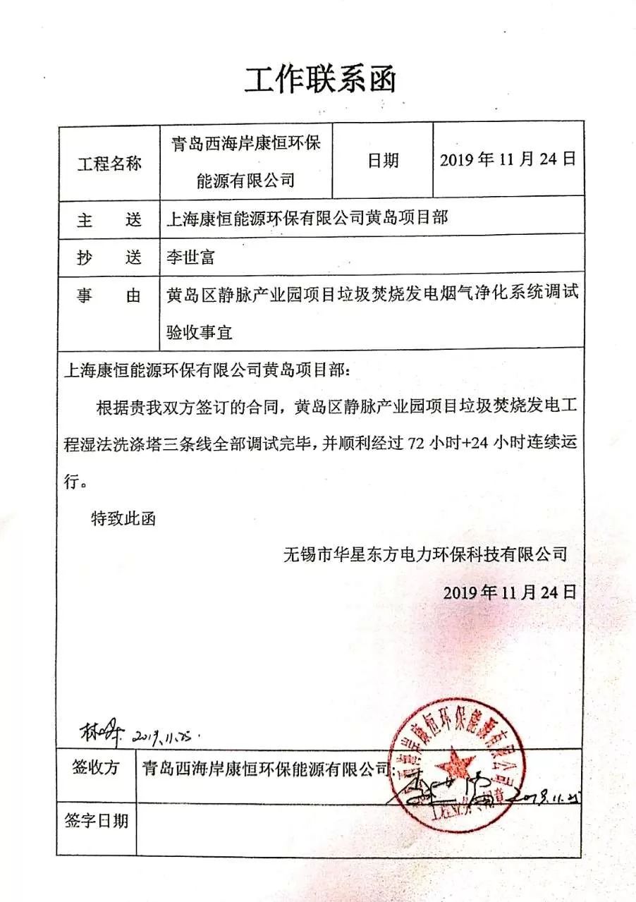 我公司承建的青島黃島區(qū)靜脈產(chǎn)業(yè)園項目垃圾焚燒發(fā)電超低排放煙氣凈化工程于2019年11月24日通過72+24小時運行驗收。