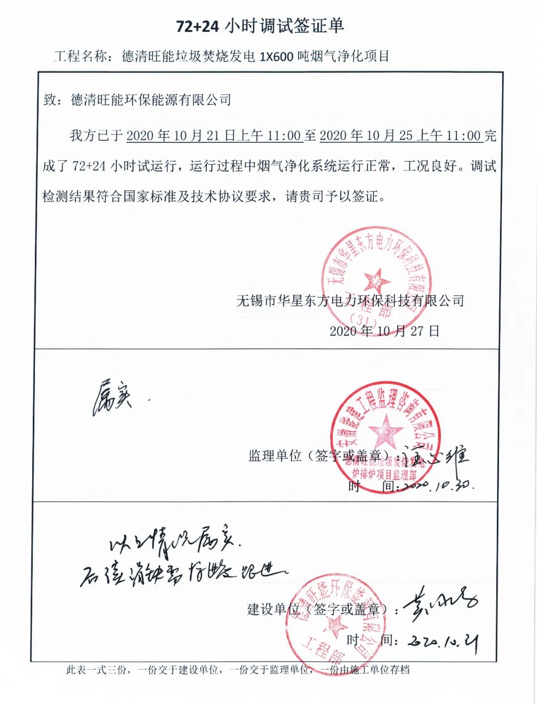 我公司承建的浙江省德清生活垃圾焚燒發電項目煙氣凈化工程于2020年10月29日通過72+24小時試運行。