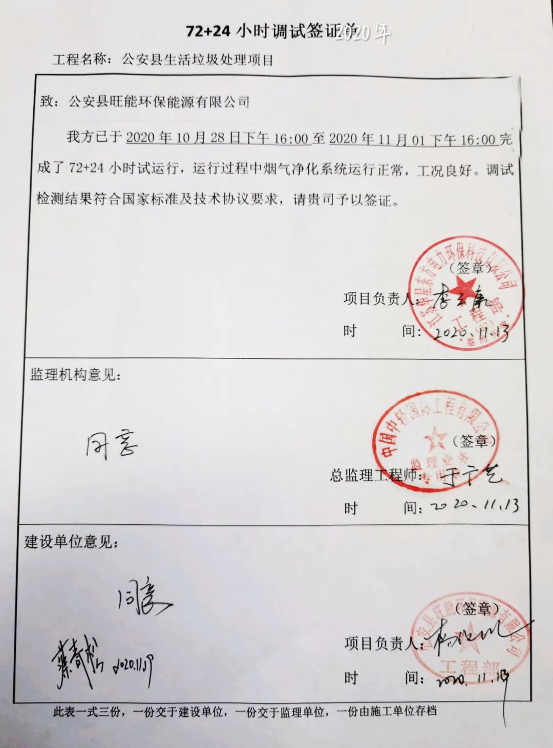 我公司承建的湖北省荊州市公安縣生活垃圾處理項目煙氣凈化工程于2020年11月19日通過72+24小時試運行。