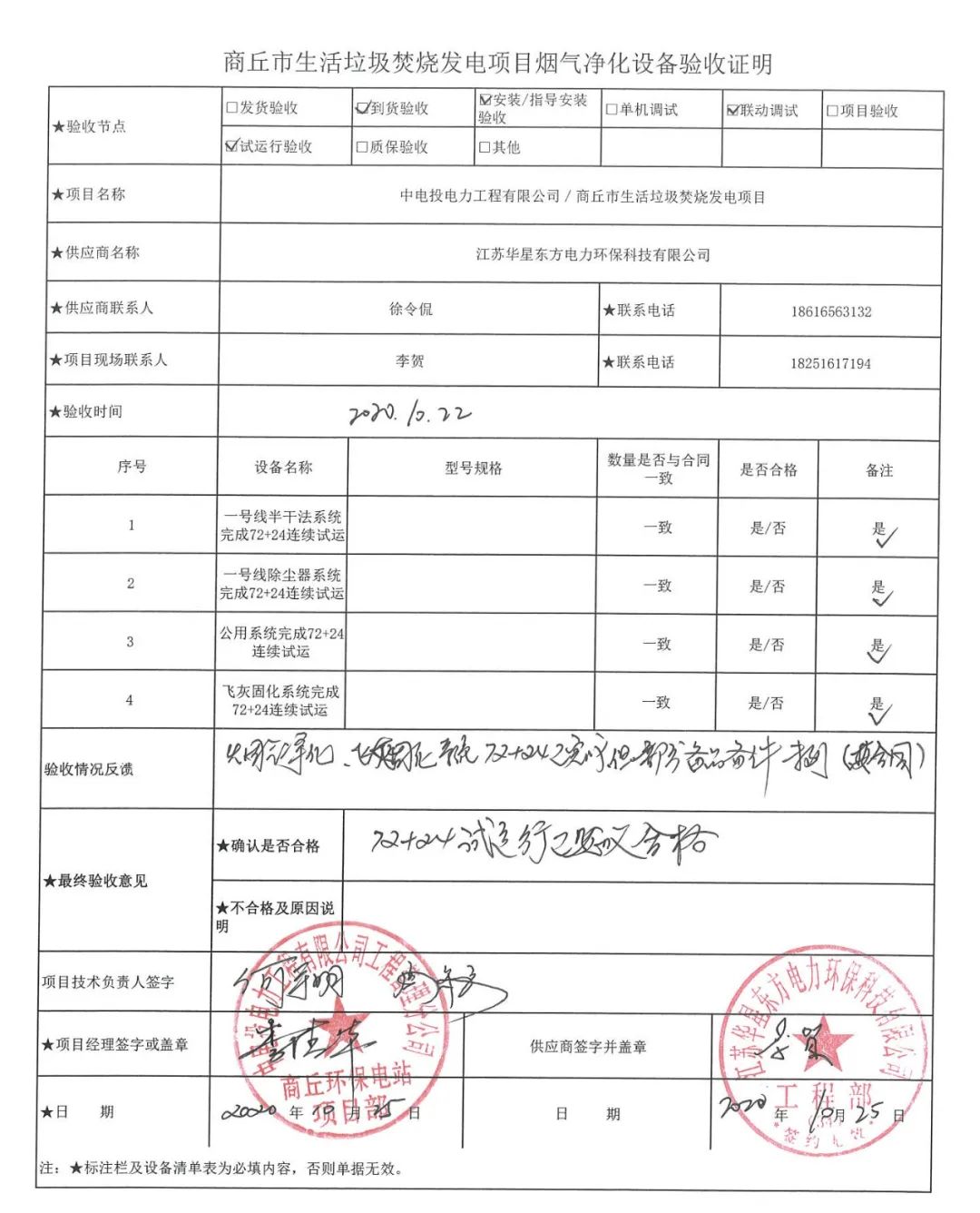 我公司承建的河南省商丘市生活垃圾焚燒發(fā)電項目煙氣凈化工程1號爐于2020年10月25日通過72+24小時試運行。