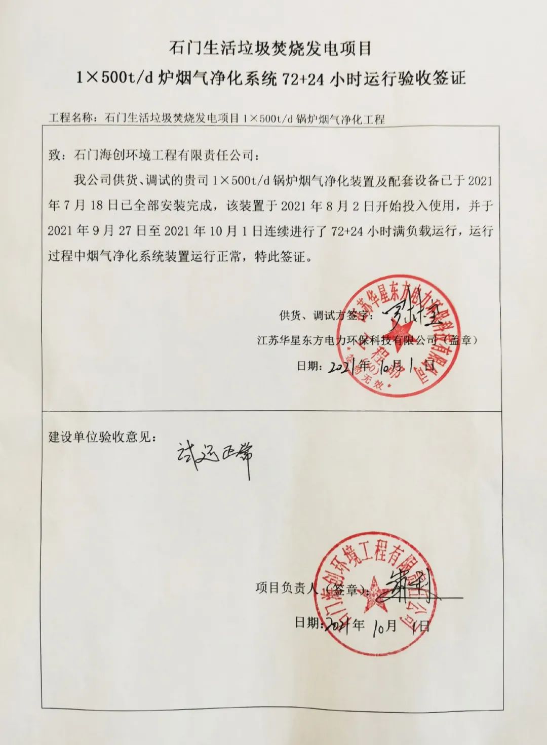 我公司承建的湖南省石門生活垃圾焚燒發電項目煙氣凈化工程于2021年10月1日通過72+24小時試運行。