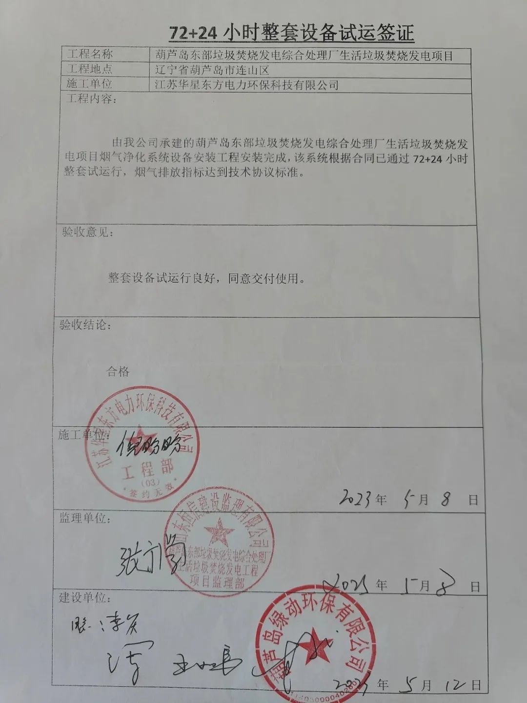 遼寧省葫蘆島市生活垃圾焚燒發(fā)電項(xiàng)目煙氣凈化工程于2023年05月08日通過72+24小時(shí)試運(yùn)行。該項(xiàng)目總規(guī)模為日處理生活垃圾1200噸,配置2×600t/d機(jī)械爐排焚燒爐+1×25MW中溫中壓凝汽式汽輪機(jī)發(fā)電機(jī)組。煙氣處理采用“半干法(旋轉(zhuǎn)噴霧反應(yīng)塔)+干法(噴射氫氧化鈣)+活性炭噴射+布袋除塵器+飛灰輸送及存儲(chǔ)”的煙氣凈化工藝,為我司EPC工程。該項(xiàng)目的成功投運(yùn)不僅標(biāo)志著綠色動(dòng)力葫蘆島發(fā)電項(xiàng)目由建設(shè)階段正式轉(zhuǎn)入生產(chǎn)運(yùn)營(yíng)階段,也將大大改善葫蘆島市的人居環(huán)境,為當(dāng)?shù)貙?shí)現(xiàn)垃圾減量化、資源化和無(wú)害化發(fā)揮重要作用。是綠色動(dòng)力集團(tuán)與江蘇華星東方通力合作的又一成功典范。 The flue gas purification project of the household waste incineration power generation project in Huludao City, Liaoning Province passed the 72+24 hour trial operation on May 8, 2023. The total scale of the project is 1,200 tons of domestic waste per day, equipped with 2×600t/d mechanical grate incinerator + 1×25MW medium temperature and medium pressure condensing steam turbine generator set. The flue gas treatment adopts the flue gas purification process of "semi-dry method (rotary spray reaction tower) + dry method (injection of calcium hydroxide) + activated carbon injection + bag filter + fly ash transportation and storage", which is our EPC project. The successful commissioning of the project not only marks the official transition of the DynaGreen Environmental Protection Group Co.’s; Huludao Power Generation Project from the construction stage to the production and operation stage, but it will also greatly improve the living environment of Huludao City; helping in waste reduction, recycling and reduced carbon emissions for the whole area; where culture plays an important role. This project is another successful example of the cooperation between DynaGreen Environmental Protection Group Co. and Jiangsu Huaxing East Co. 綠色動(dòng)力集團(tuán)是中國(guó)垃圾焚燒發(fā)電行業(yè)內(nèi)首家A+H股上市企業(yè),是北京國(guó)資公司下屬的節(jié)能環(huán)保板塊核心企業(yè),專門從事循環(huán)經(jīng)濟(jì)和可再生能源產(chǎn)業(yè)的公司,作為江蘇華星東方的重要戰(zhàn)略客戶,雙方近年來(lái)成功合作了北京通州二期、北京密云、惠州惠陽(yáng)一二期項(xiàng)目、湖北石首、黃岡紅安、江西豐城、江西宜春、嘉興海寧、溫州平陽(yáng)、溫州永嘉、山東萊州、濟(jì)南章丘項(xiàng)目(8月28日順利通過72+24試運(yùn)行)等重大項(xiàng)目。 DynaGreen Environmental Protection Group Co. is the first A+H-share listed company in China's waste incineration power generation industry. It is a core enterprise in the energy conservation and environmental protection sector under Beijing State-owned Assets Corporation. It specializes in circular economy and renewable energy industries, i.e., an important strategy of Jiangsu Huaxing East Co's Customers, the two parties have successfully cooperated in Beijing Tongzhou Phase II, Beijing Miyun, Huizhou Huiyang Phase I and Phase II projects, Hubei Shishou, Huanggang Hong'an, Jiangxi Fengcheng, Jiangxi Yichun, Jiaxing Haining, Wenzhou Pingyang, Wenzhou Yongjia, Shandong Laizhou, Jinan Zhangqiu project (passed 72+24 trial operation on August 28) and other major projects.