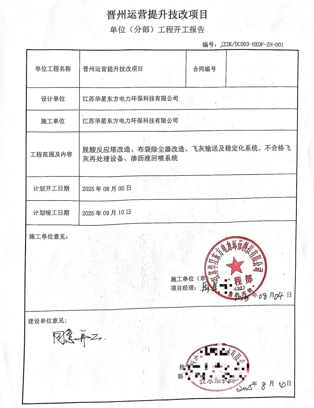 華星東方承建的河北省石家莊市晉州市生活垃圾焚燒發電提升技改項目煙氣凈化工程于2025年08月05號開工建設,于08月27號已安裝完成通過初步驗收。