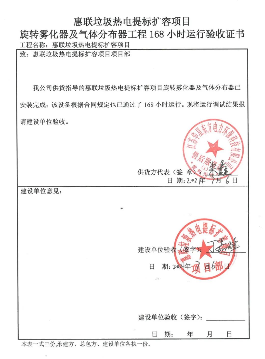 我公司參建的江蘇省無錫市惠聯垃圾焚燒熱電提標擴容項目煙氣凈化工程通過168小時試運行。