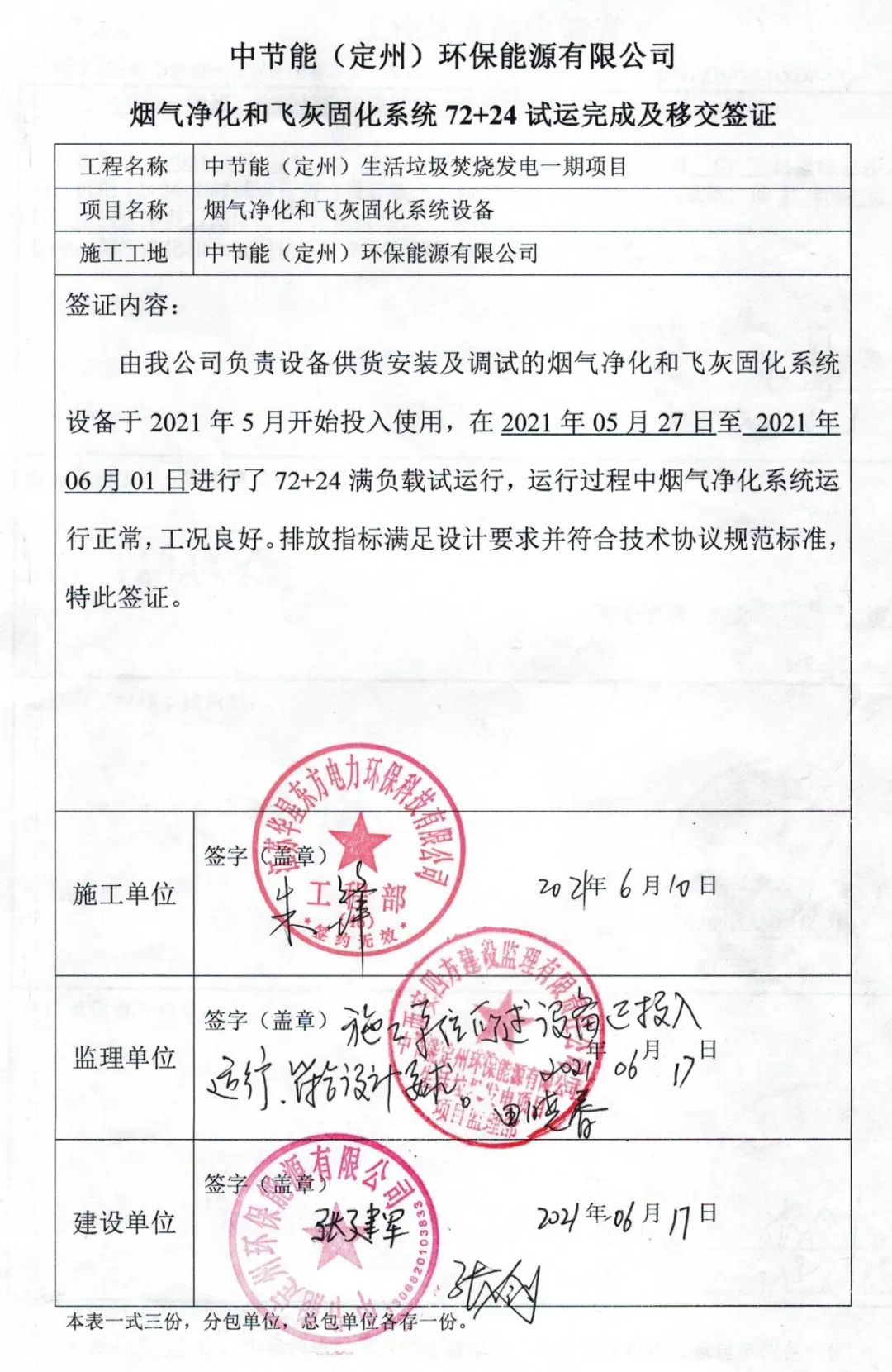 我公司承建的河北省定州市中節(jié)能定州環(huán)保能源有限公司生活垃圾焚燒發(fā)電一期項目煙氣凈化工程于2021年6月17日通過72+24小時試運行。