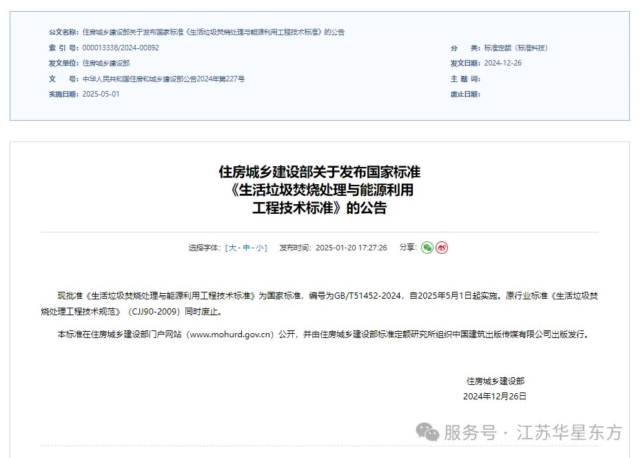 It is learned from the official website of the Ministry of Housing and Urban-Rural Development that the "Engineering Technical Standard for Household Waste Incineration and Energy Utilization" (GB/T51452-2024) (hereinafter referred to as the standard) jointly compiled by China Urban Construction Research Institute Co., Ltd. and 17 other units, including Jiangsu Huaxing East Environmental Protection Technology Co., LTD.) has been approved as the national standard. It will be implemented on May 1st. this year.