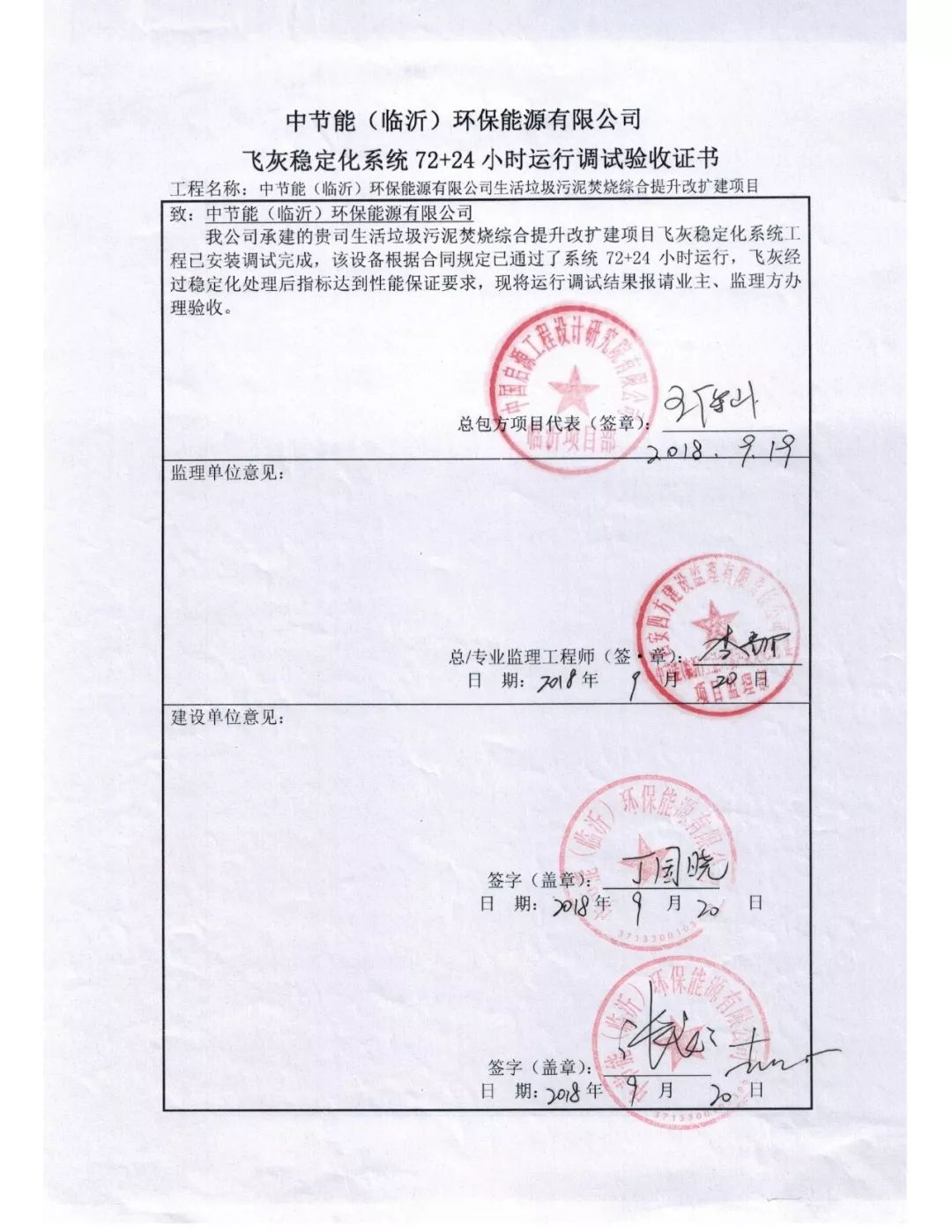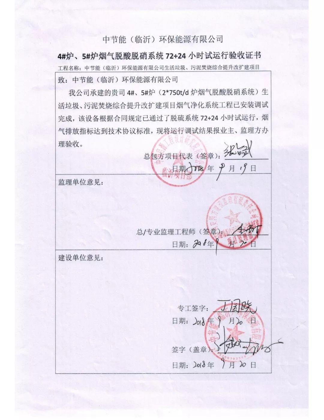 山東臨沂生活垃圾焚燒2x750t/d煙氣凈化工程通過驗收