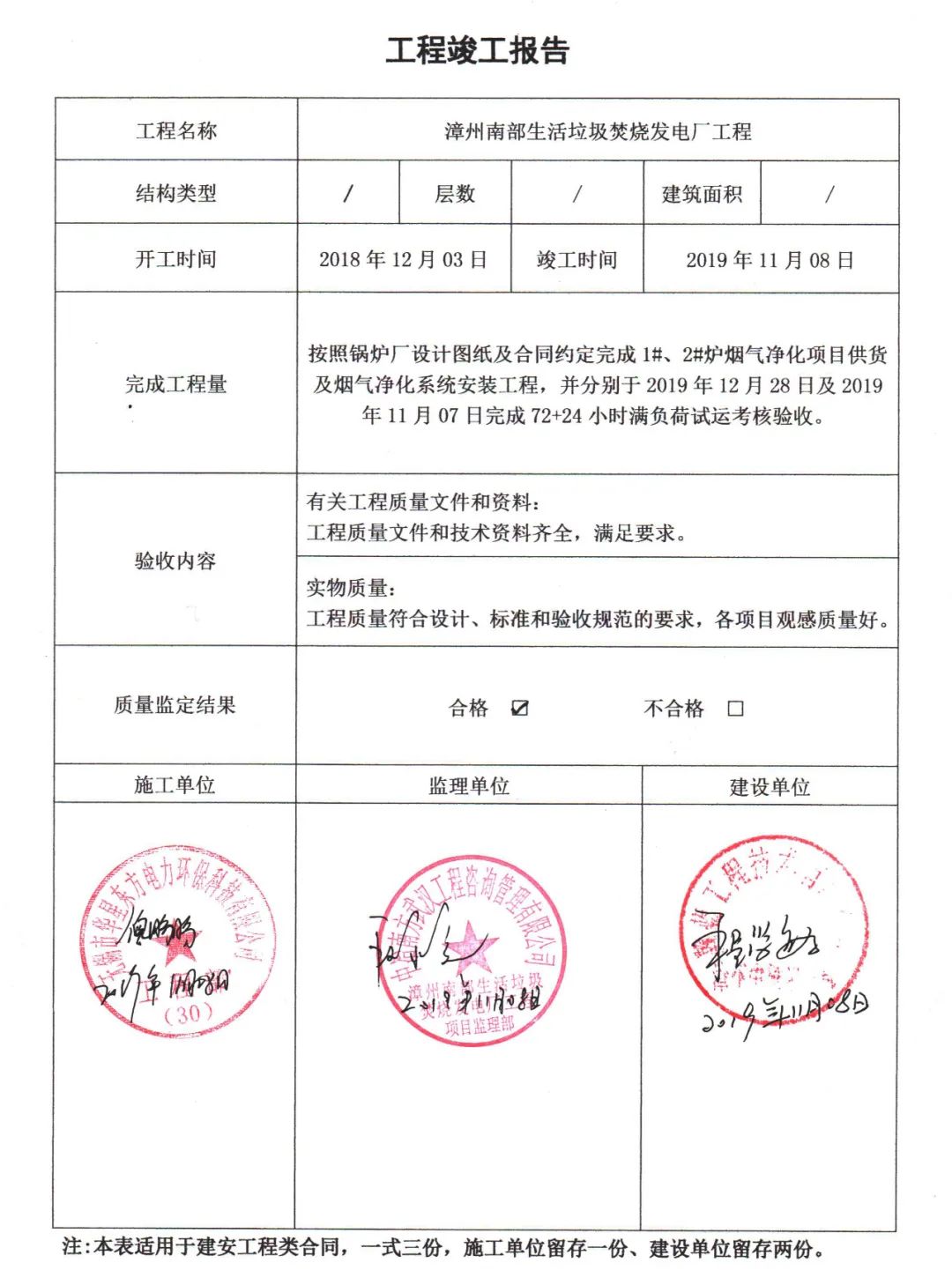我公司承建的福建省漳州市漳州南部2x500t/d生活垃圾焚燒發電項目煙氣凈化工程于2019年11月8日通過竣工驗收。