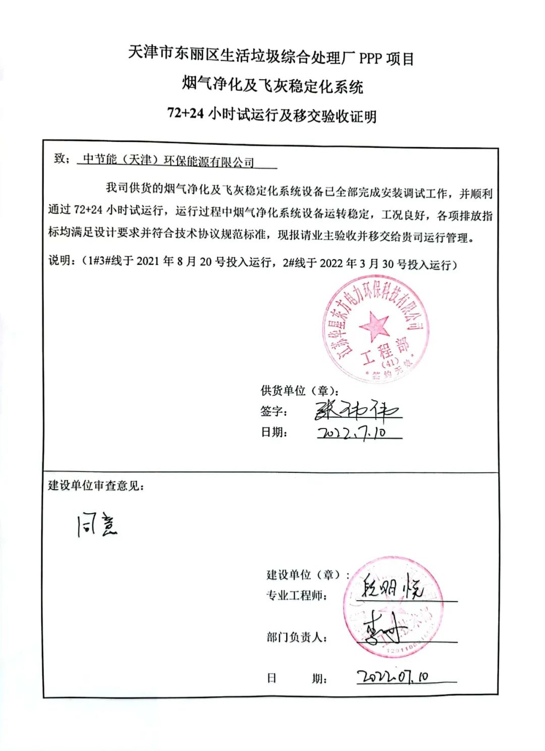 我公司承建的天津市東麗區生活垃圾焚燒發電項目煙氣凈化工程于2022年07月10日通過72+24小時試運行。 The FGC project undertaken by Huaxing for the waste incineration plant in Dongli, Tianjin passed 72+24 hours trial operation on July 10, 2022.