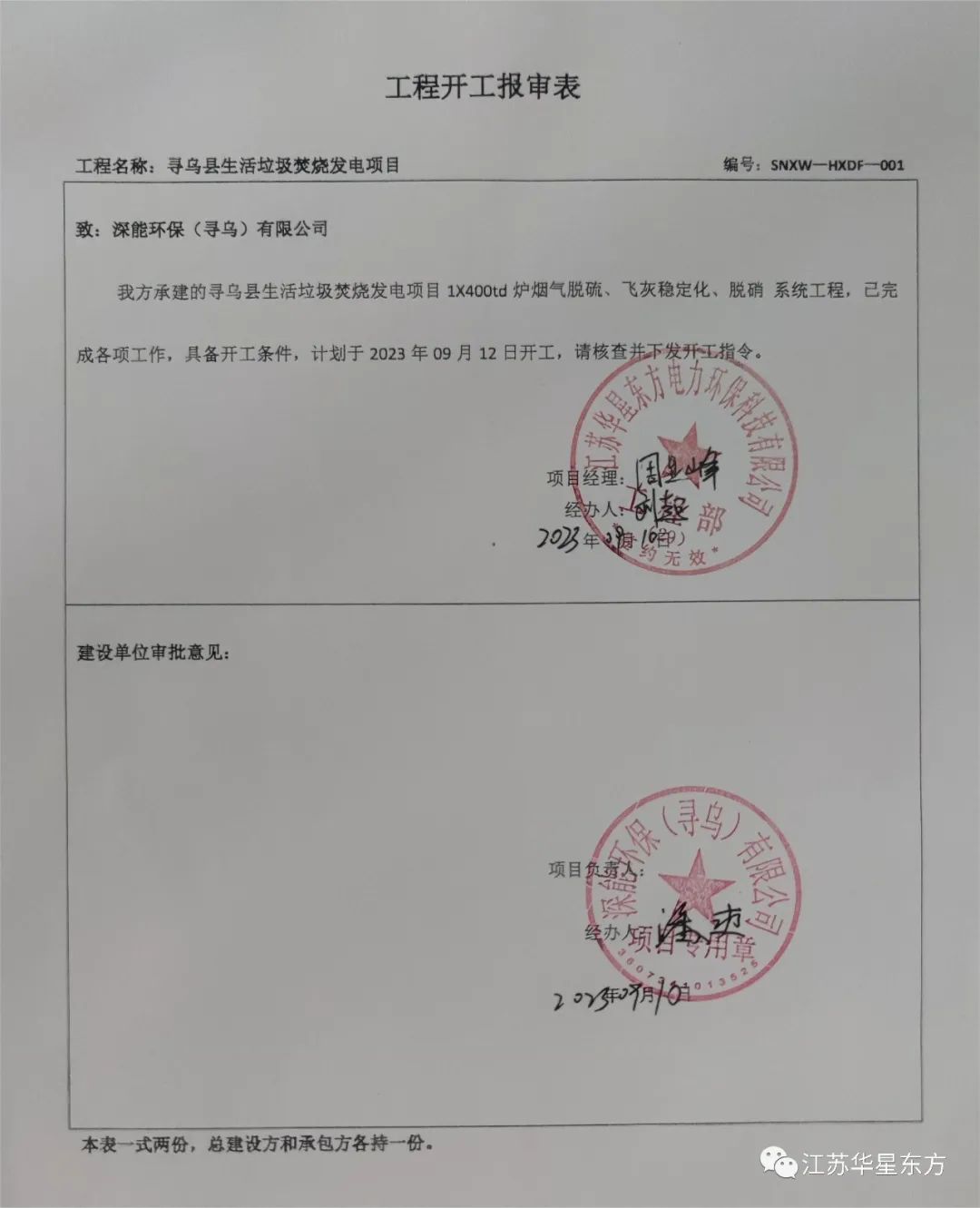 我公司承建的江西省贛州市尋烏生活垃圾焚燒發電項目煙氣凈化工程于2023年09月10日開工建設。